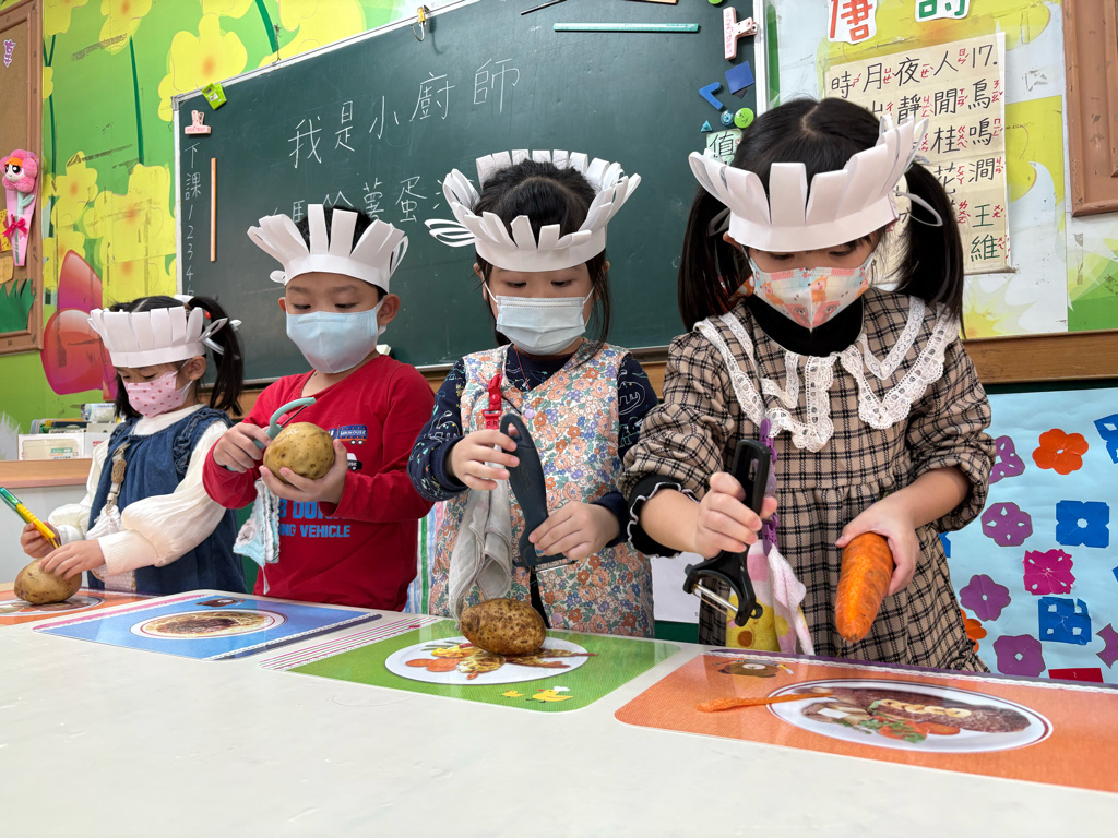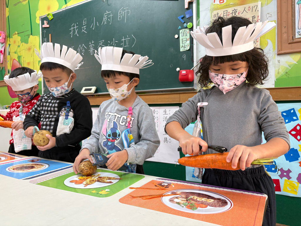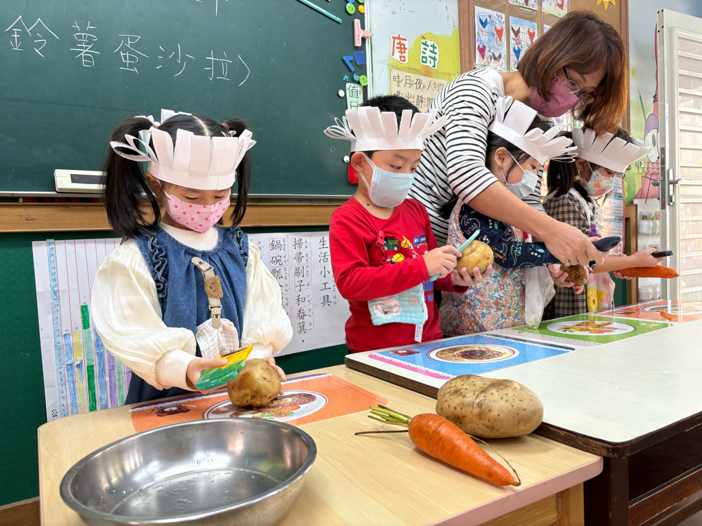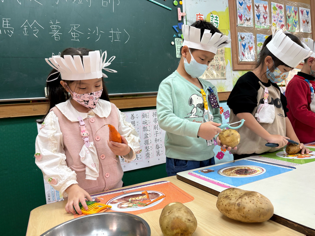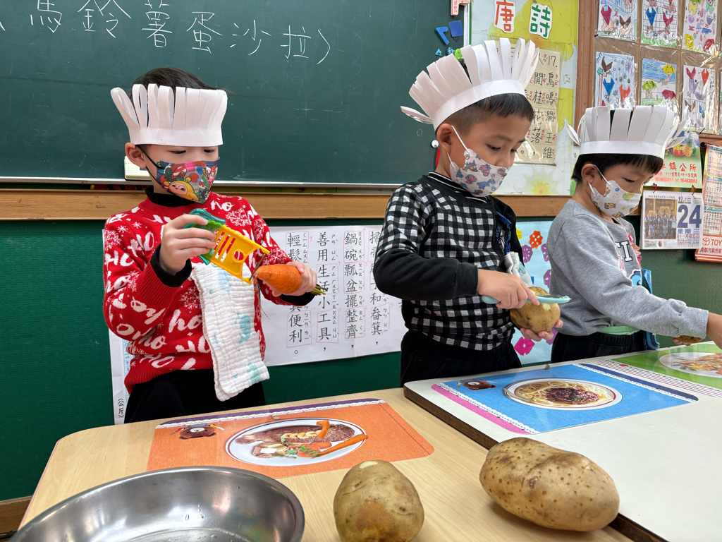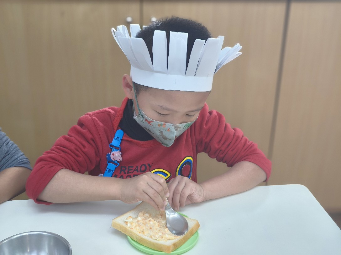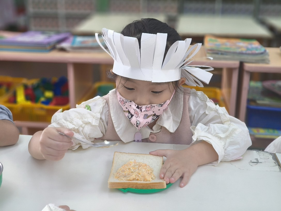 小廚師當然要有廚師帽囉!為了今天的主題活動我們製作了帽子、然後體驗清洗、削皮、切塊、烹煮、壓泥、調味、抹醬夾吐司、再來品嚐好吃😋的薯泥蛋沙拉嗯~太美味了😋