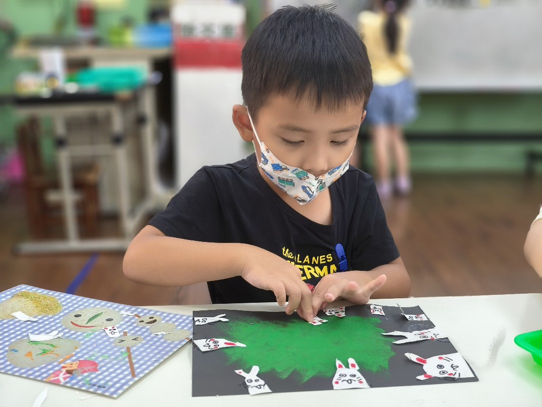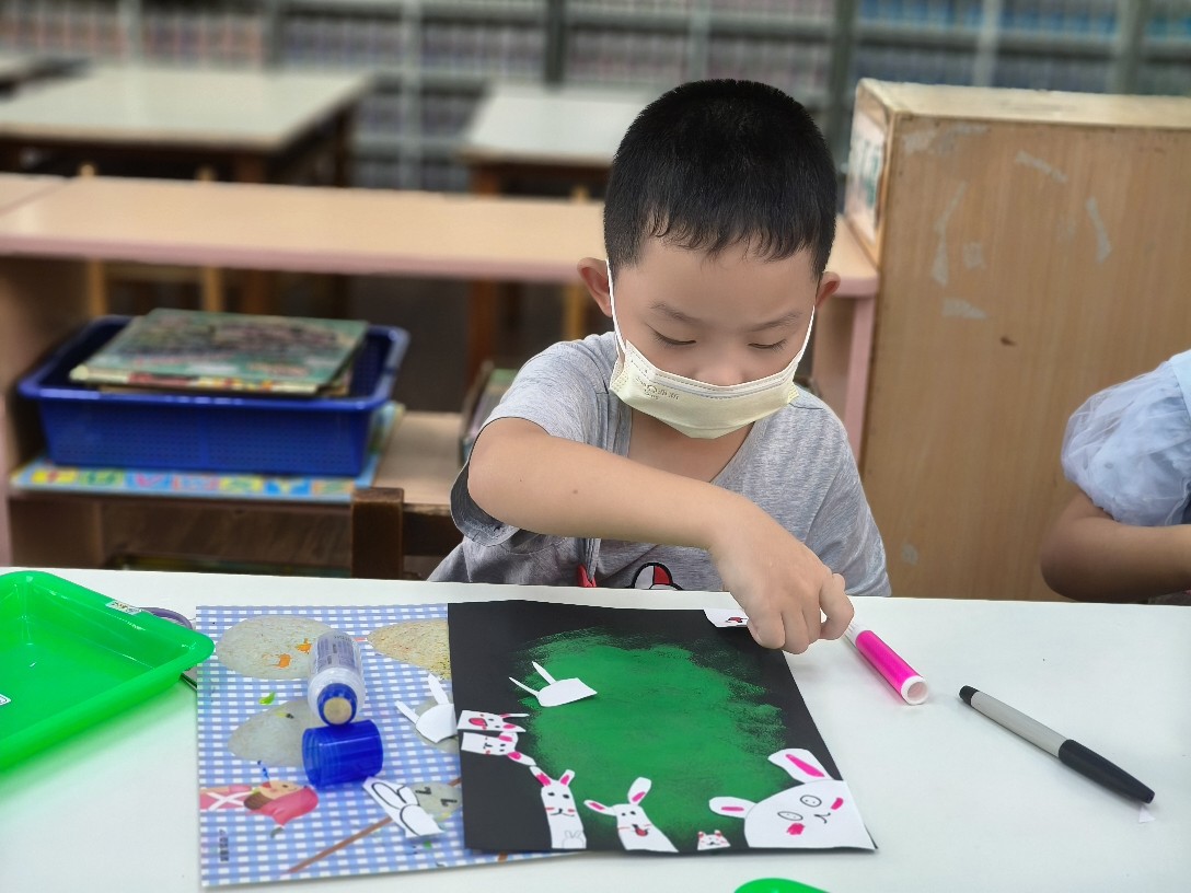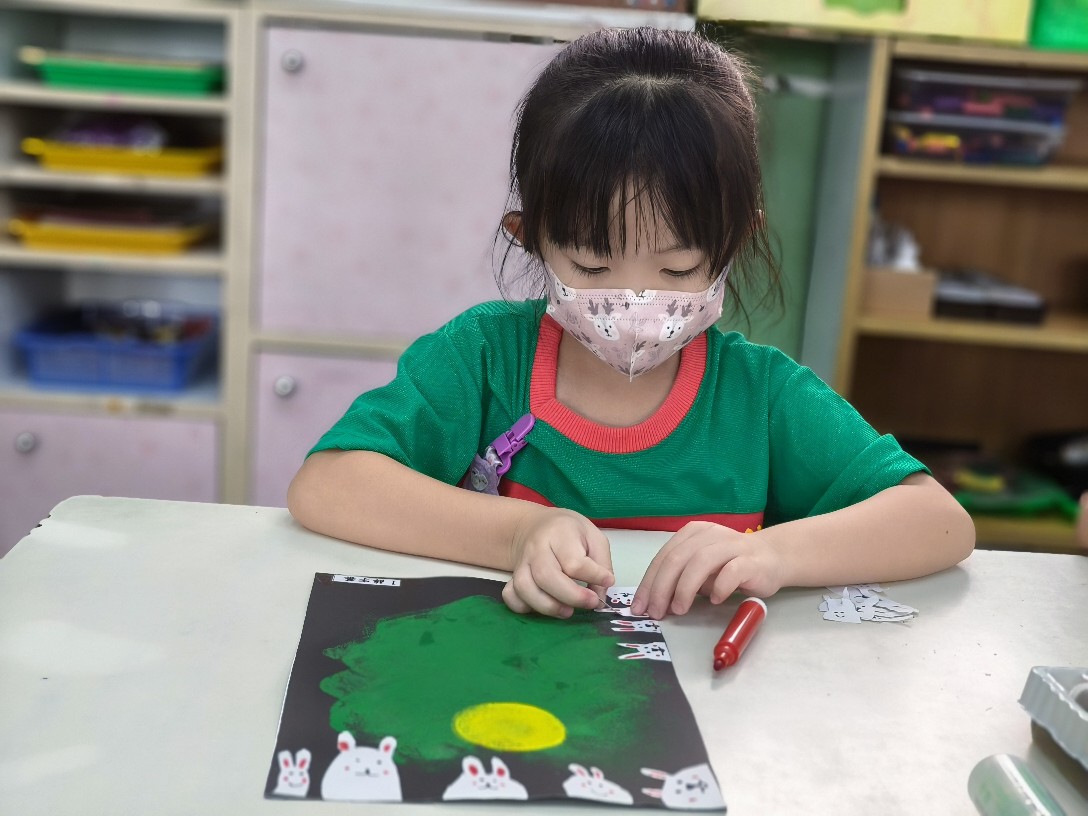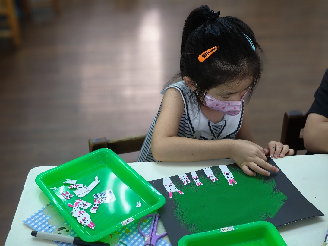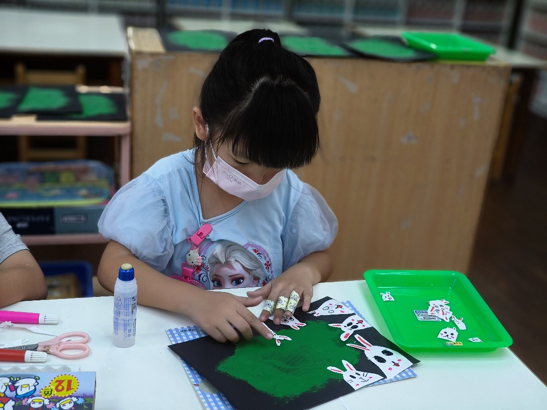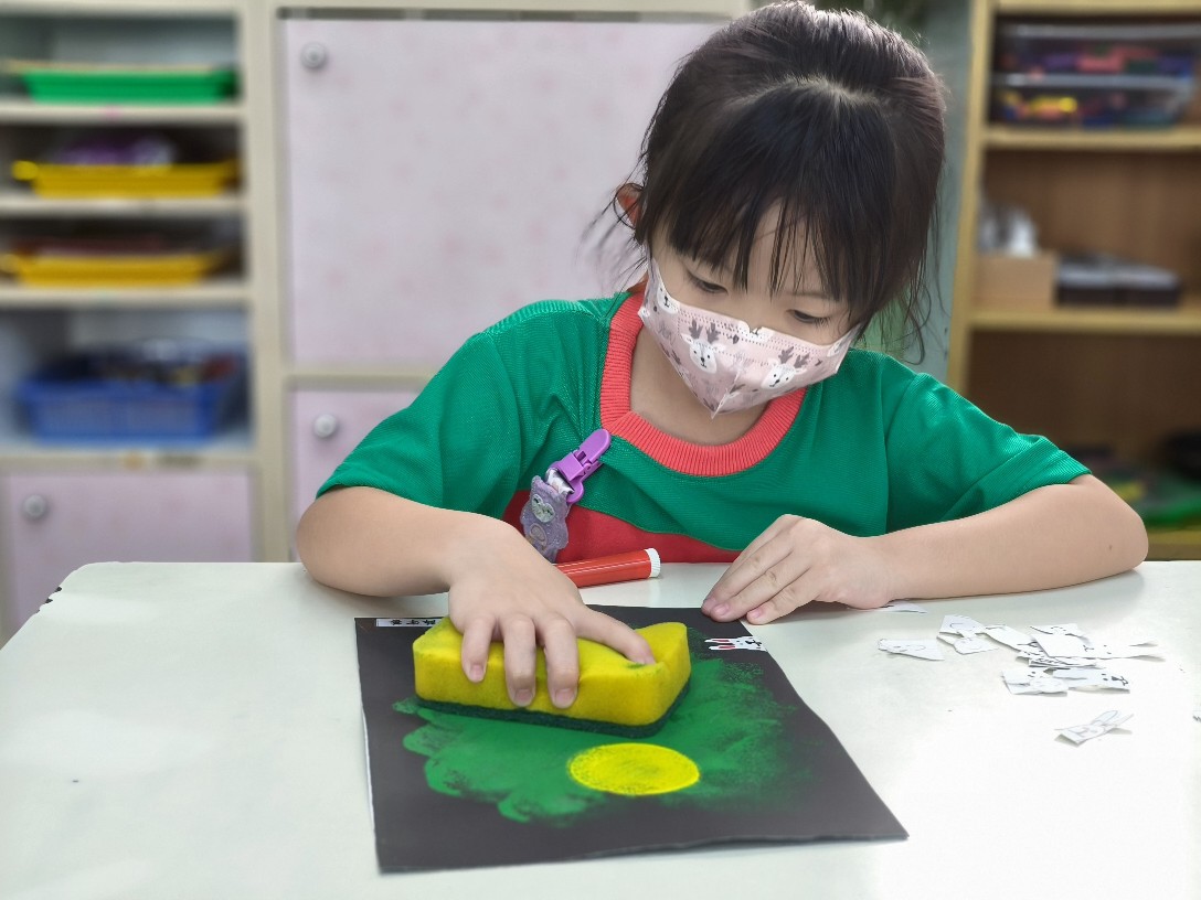 利用海棉蓋印出草地&月亮,再剪貼出多種不同表情的萌萌兔唷!