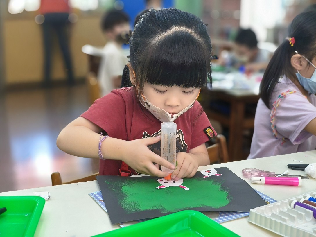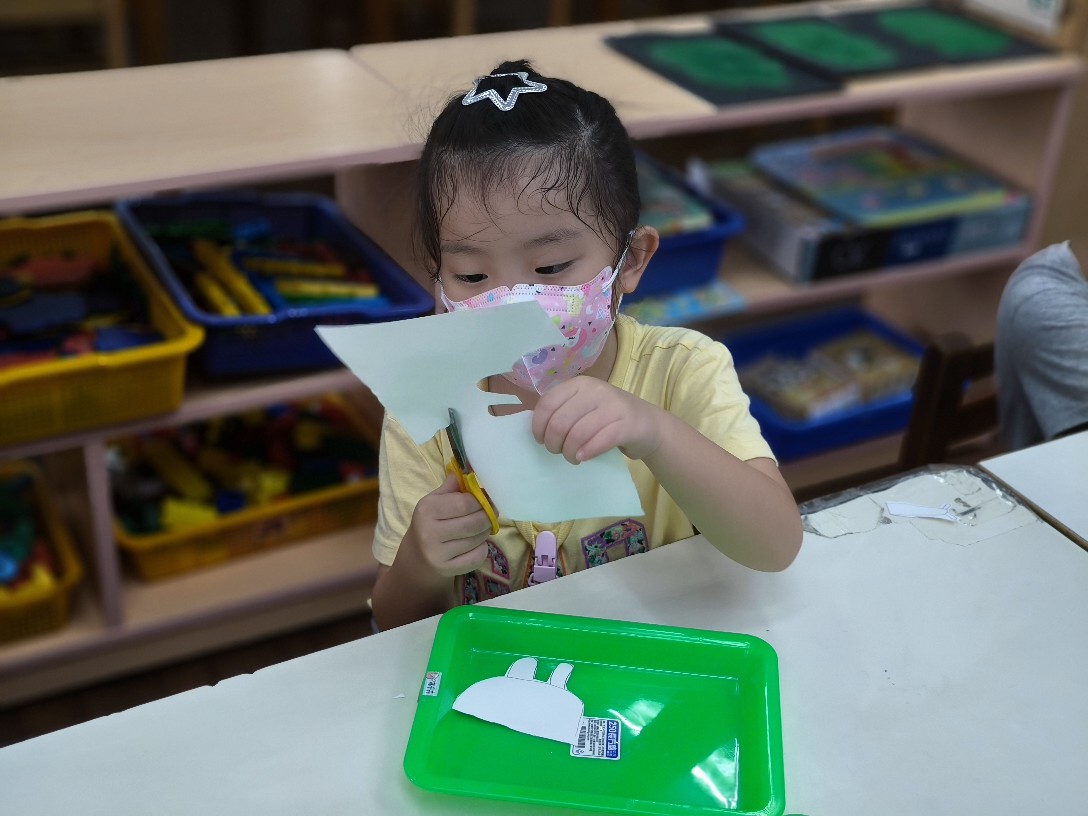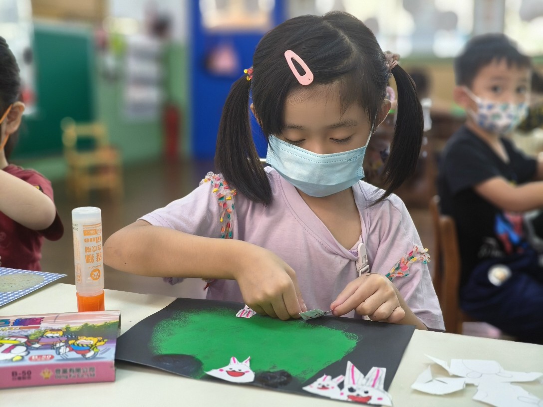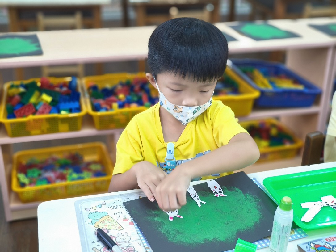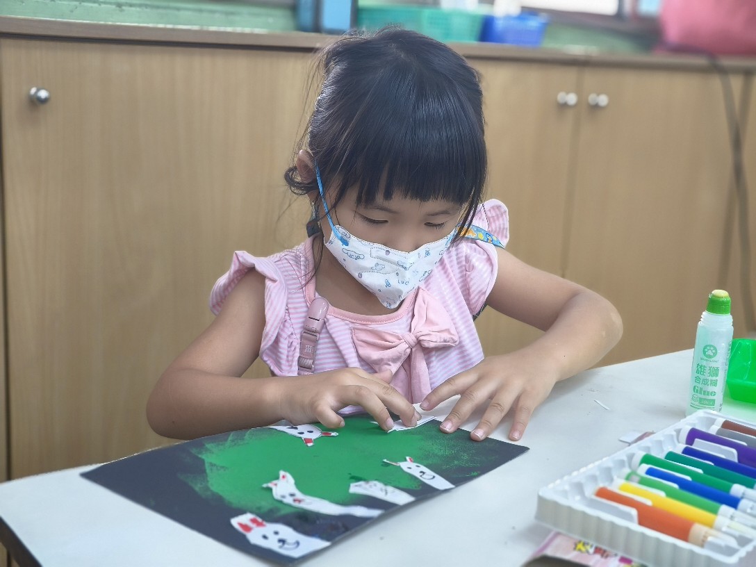 利用海棉蓋印出草地&月亮,再剪貼出多種不同表情的萌萌兔唷!