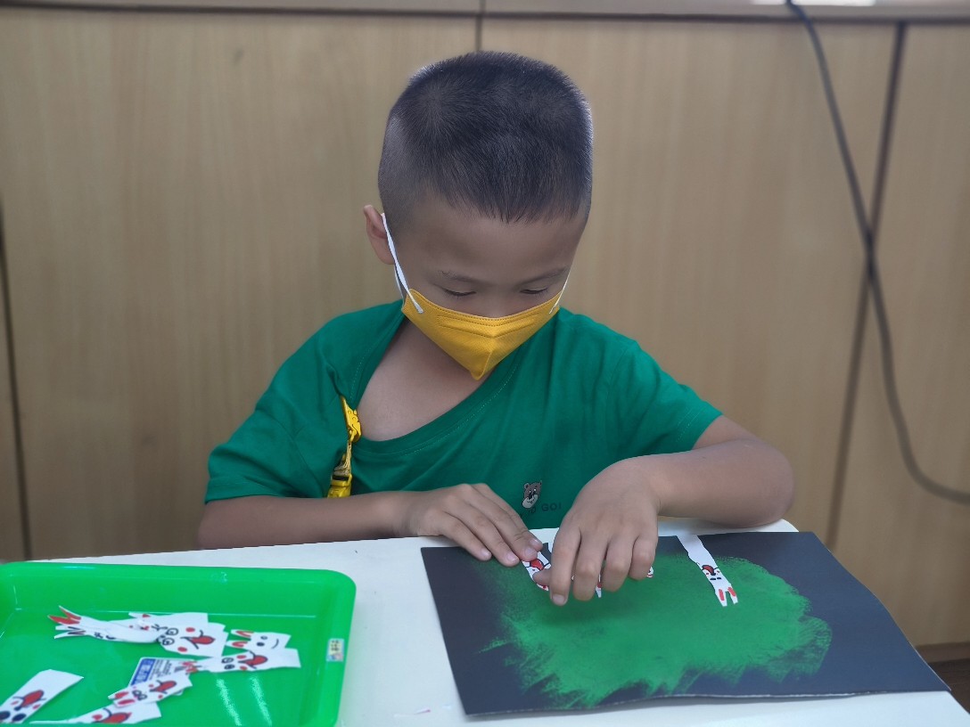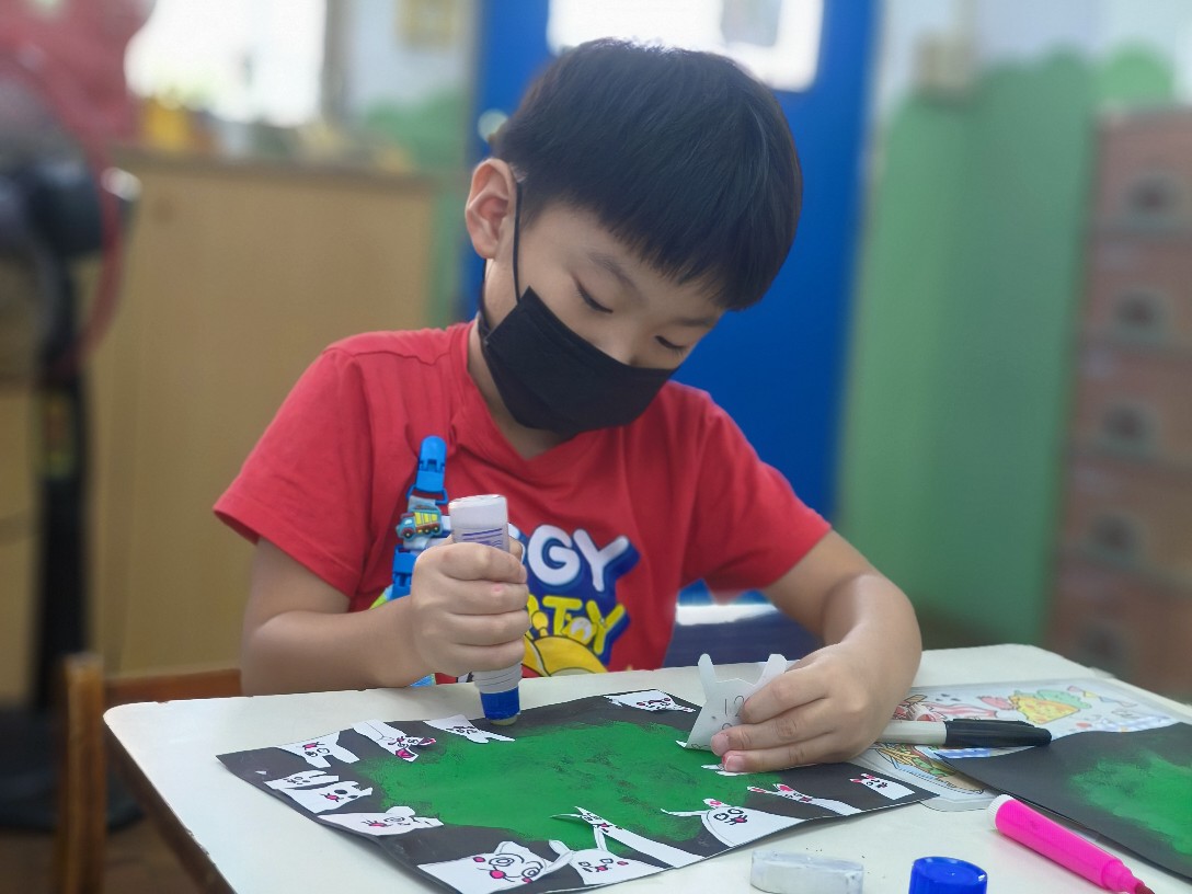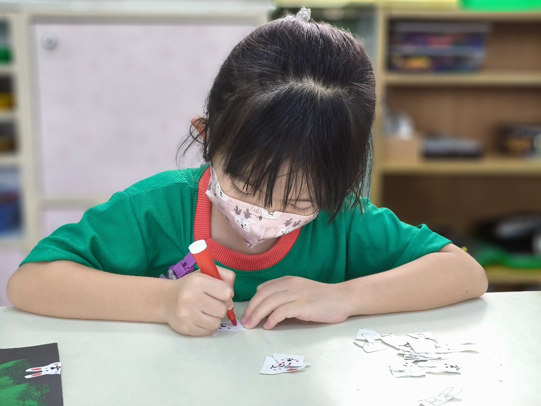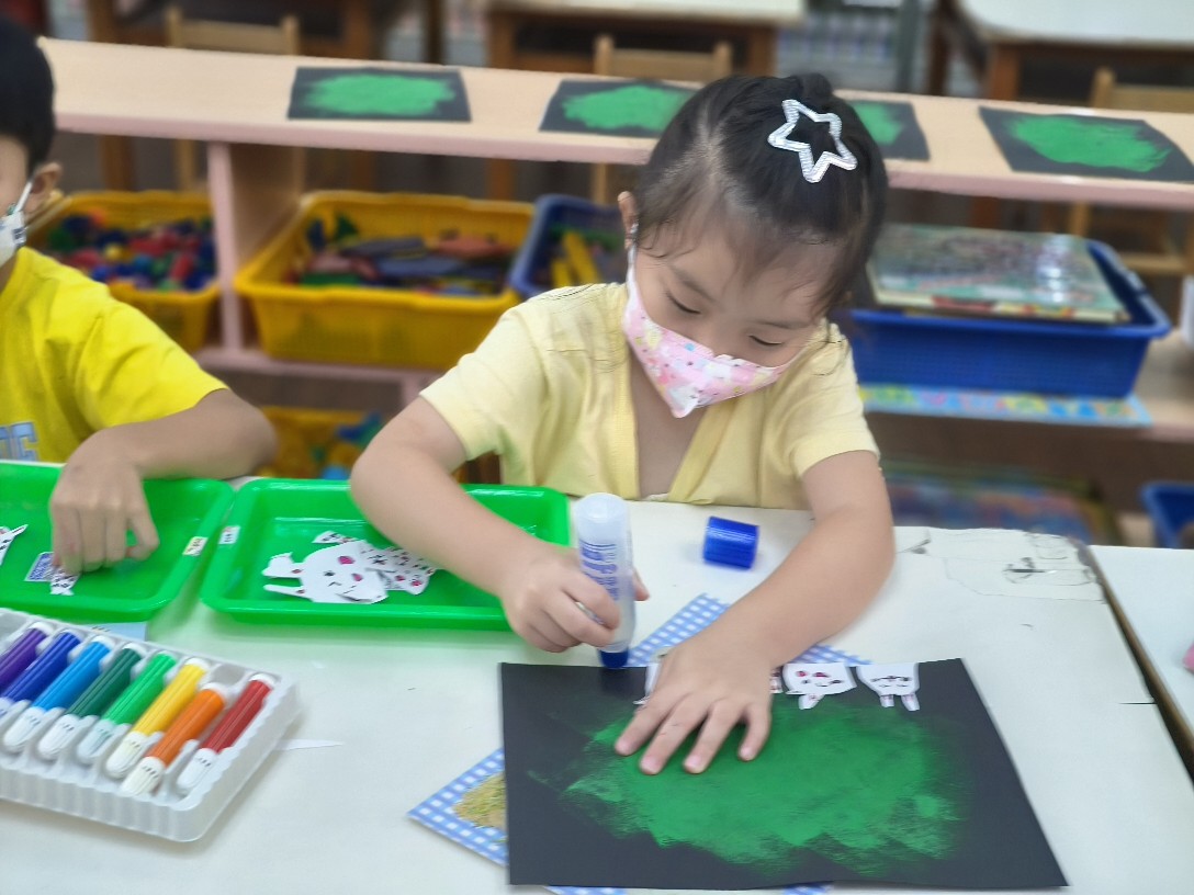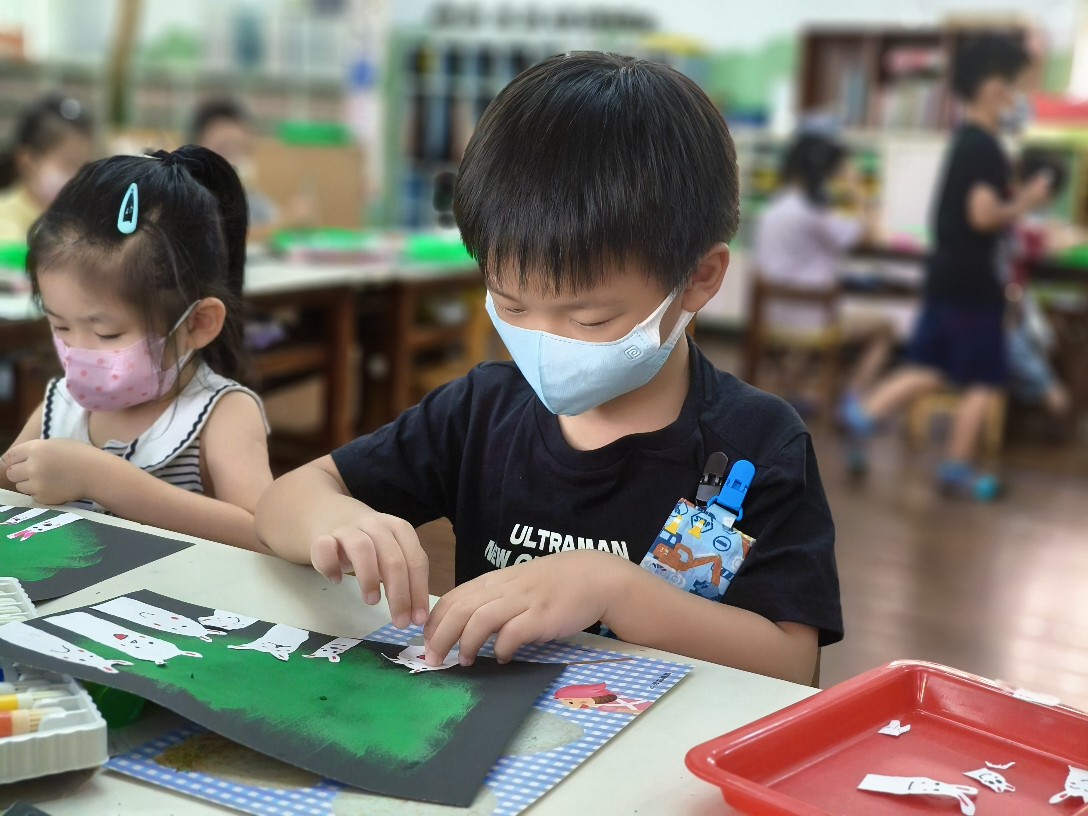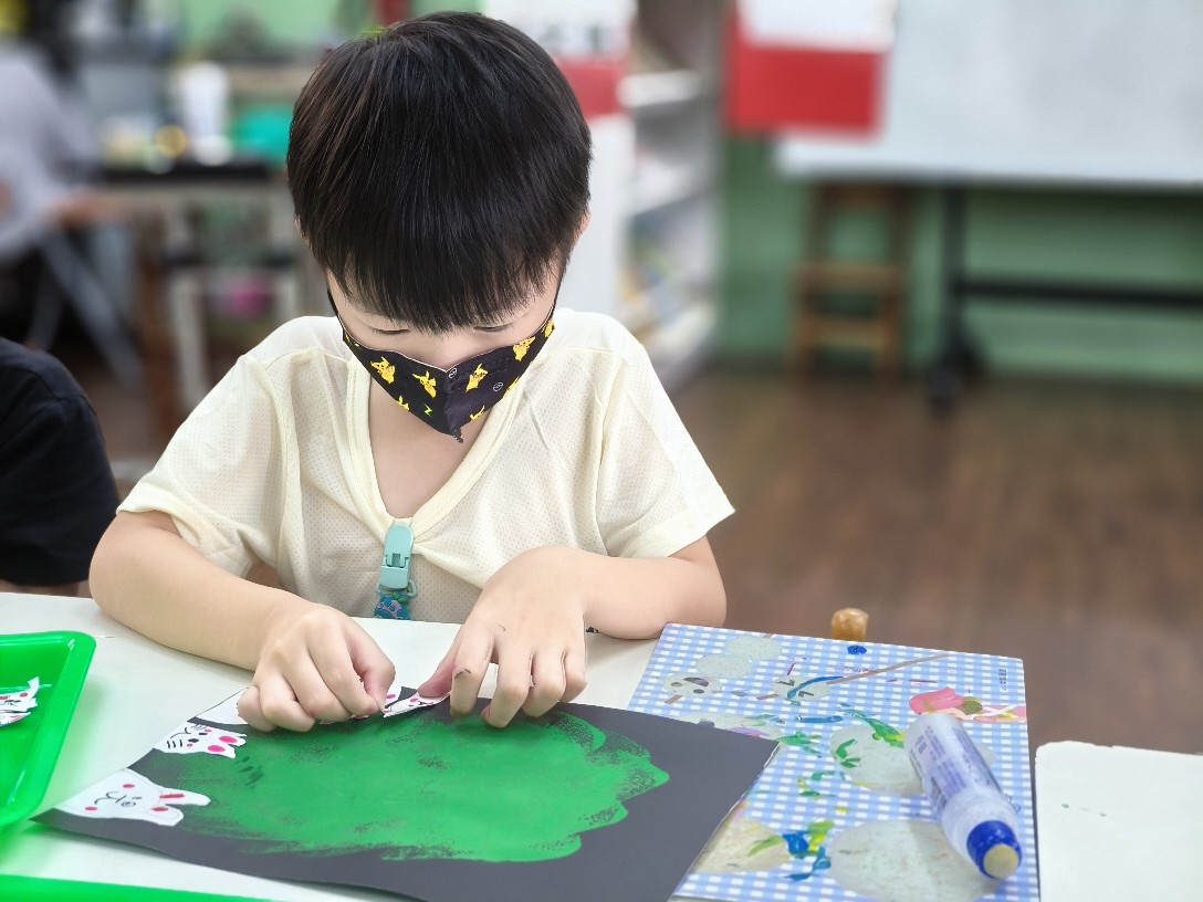 利用海棉蓋印出草地&月亮,再剪貼出多種不同表情的萌萌兔唷!